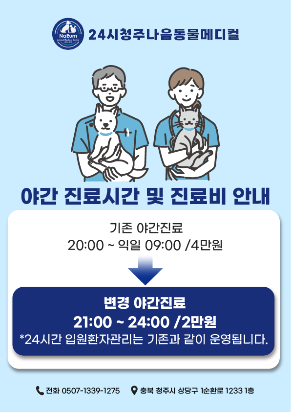안녕하세요. 24시 청주 나음동물메디컬 원장 이희준, 원장 노성준입니다.